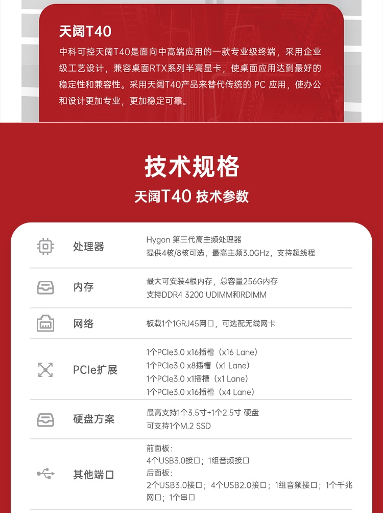 中科可控 T40 国产塔式工作站 2025/12/24 台式机 53 0 中科可控天阔T40 中科可控天阔T40是采用企业级工艺设计,兼容桌面RTX系列半高显卡,使桌面应用达到好的稳定性和兼容性。采用天阔T40产品来替代传统的PC应用,使办公和设计专业稳定可靠。