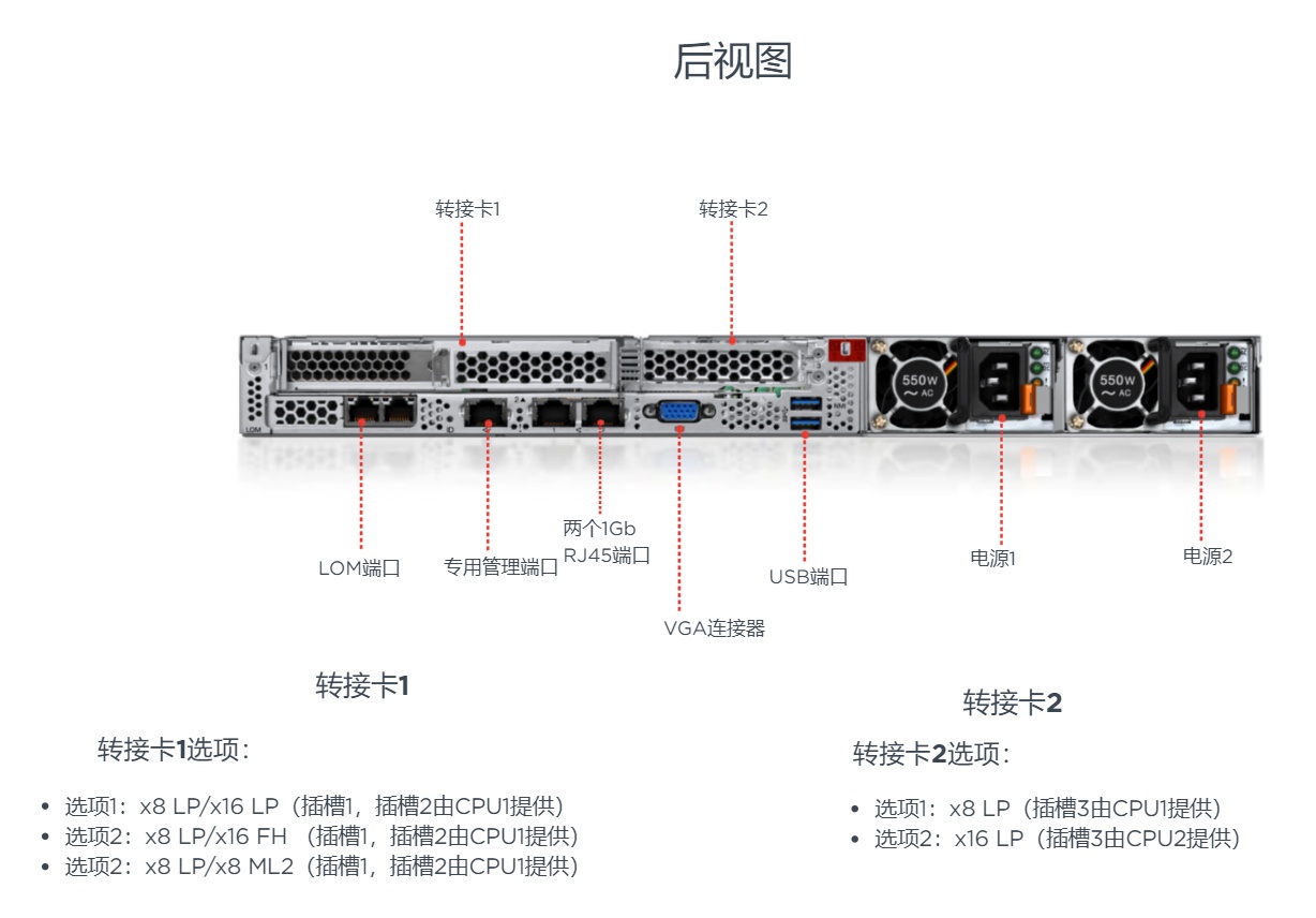 | 网络接口 | 2个1GbE端口+1个专用1GbE管理端口(标配) 可选模块化LOM支持2个1GbEBase-T或2个10GbE,利用Base-T或SFP+ |