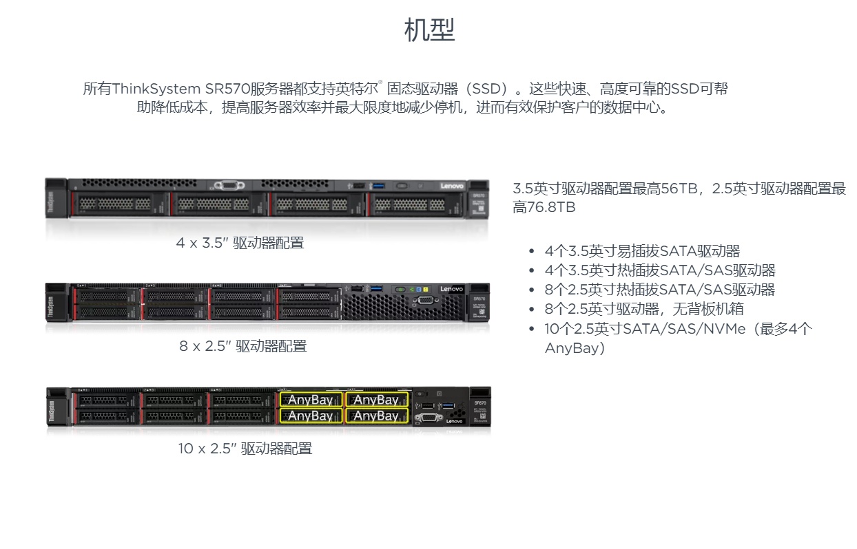 | 驱动器托架 | 多达 10 个 2.5 英寸硬盘(可选配4 个直连AnyBay)或4 个 3.5 英寸硬盘 |