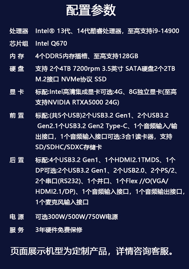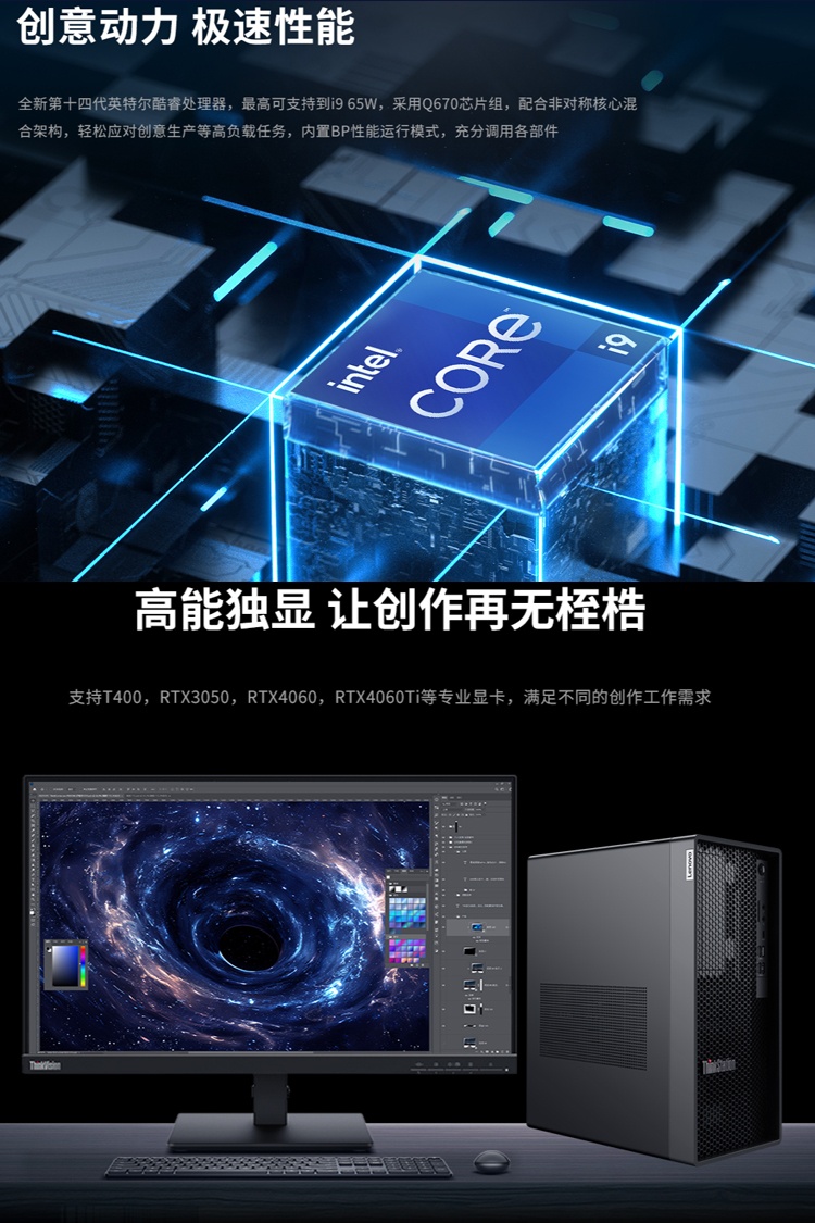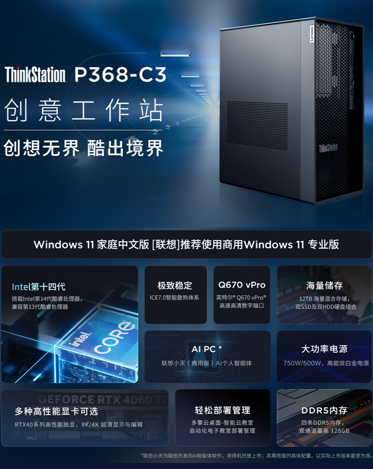 联想ThinkStation P368-C3工作站支持英特尔第14代酷睿i9或i7处理器,可配置DDR5高速内存与大容量混合存储,并能选配从集成显卡到NVIDIA RTX系列专业独立显卡。其多核处理能力与图形性能可满足三维建模、渲染及数据分析等专业应用需求,适用于设计、科研及高端办公场景。
