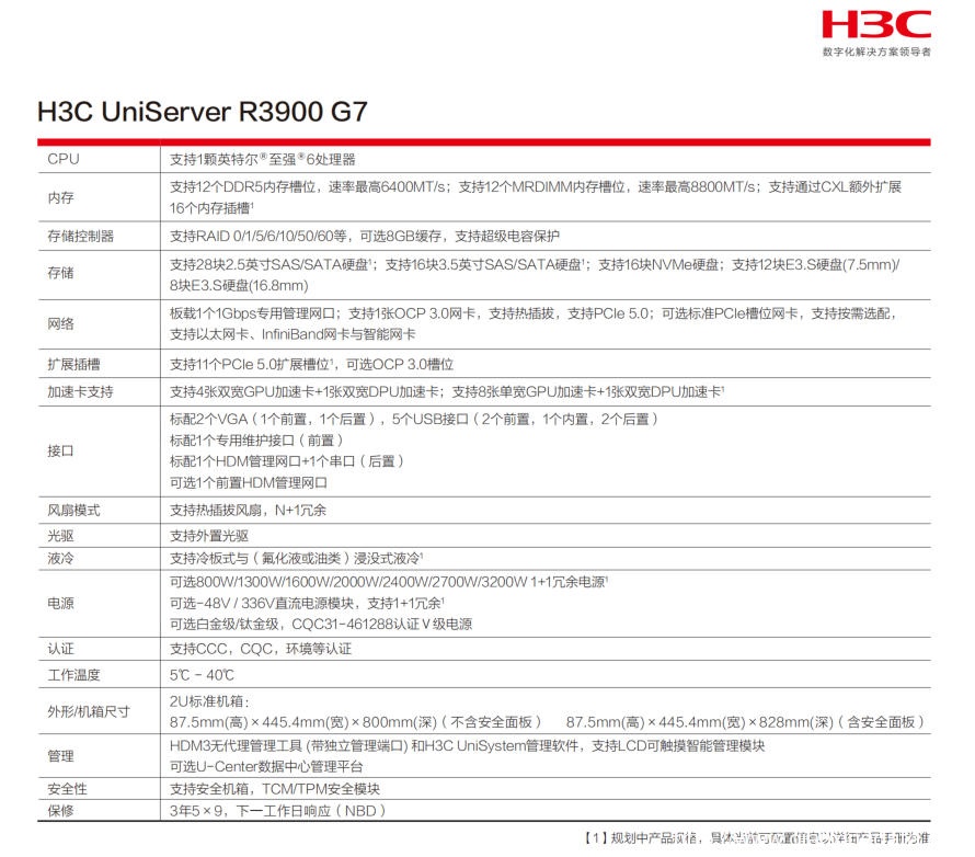 H3C UniServer R3900 G7服务器是H3C基于英特尔Birch Stream平台自主研发的2U单路机架式服务器,该服务器可应用于通用计算场景,包括云计算、虚拟化、科学计算和AI计算等场景,适用于互联网、运营商、企业等各行业典型应用,在计算性能、功耗节能、扩展能力和可靠性上均衡全能,易于管理和部署,助力企业实现降本增效。