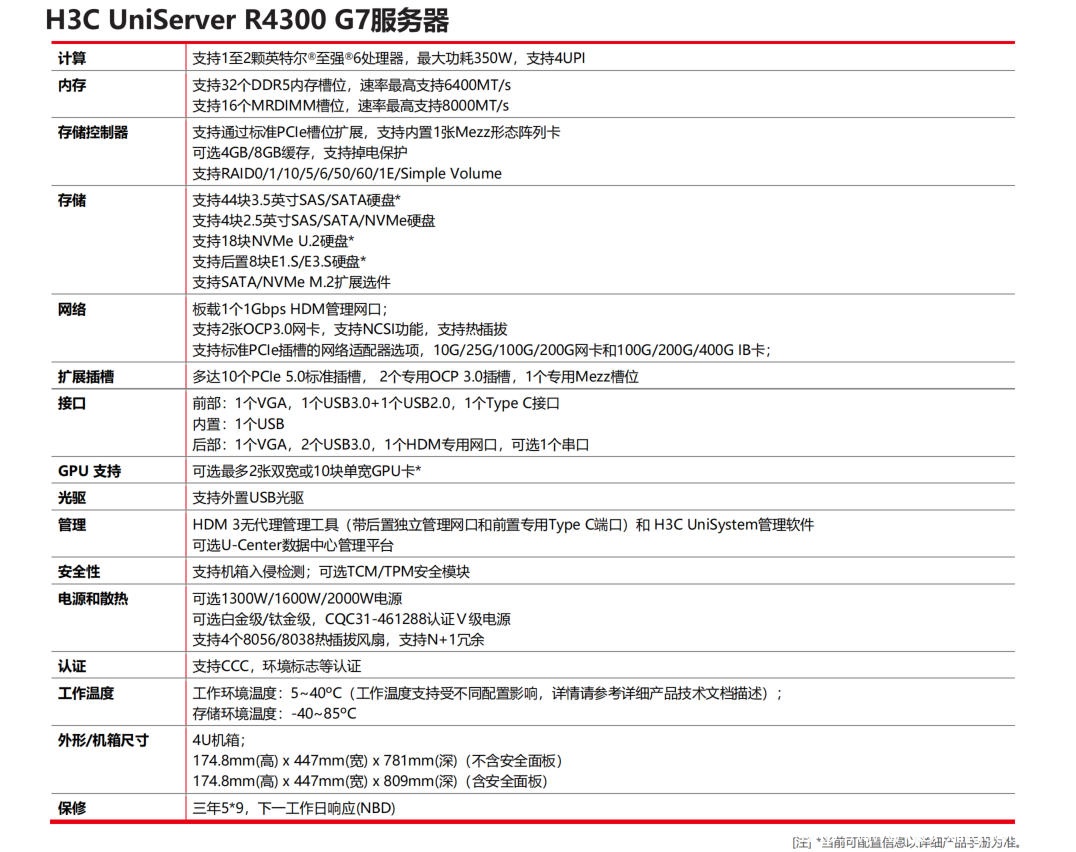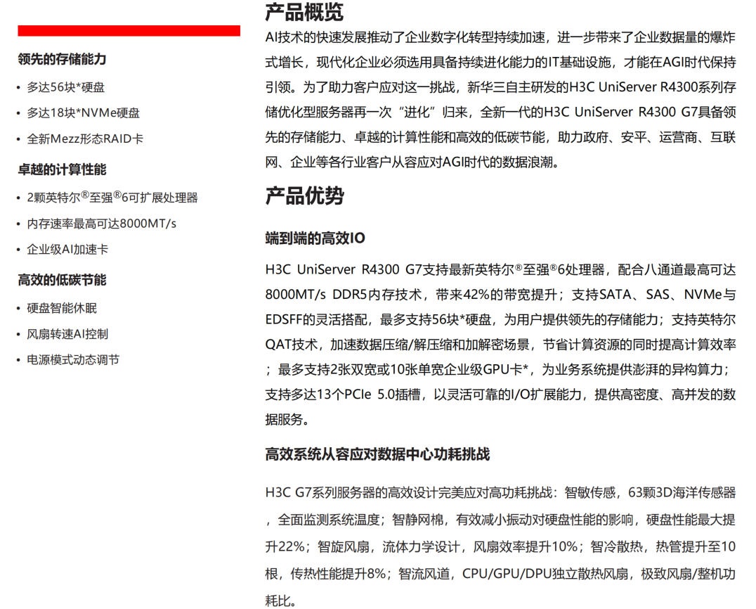 H3C UniServer R4300 G7支持英特尔®至强®6处理器,配合八通道高达8000MT/s DDR5内存技术,带来42%的带宽提升;支持SATA、SAS、NVMe与EDSFF的灵活搭配,支持56块*硬盘,为用户提供存储能力;支持英特尔QAT技术,加速数据压缩/解压缩和加解密场景,节省计算资源的同时提高计算效率;支持2张双宽或10张单宽企业级GPU卡,为业务系统提供澎湃的异构算力;支持多达13个PCIe 5.0插槽,以灵活可靠的I/O扩展能力,提供高密度、高并发的数据服务。