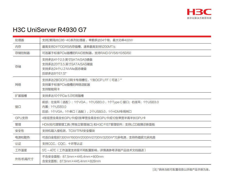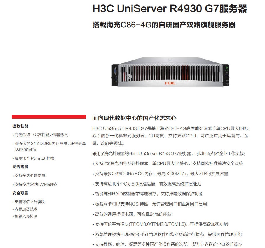 H3C UniServer R4930 G7 2U单路机架式服务器 2025/09/11 H3C服务器 服务器 551 0 H3C UniServer R4930 G7 H3C UniServer R4930 G7是基于海光C86-4G高性能处理器(单CPU64核心)的新一 代机架式服务器,2U高度,支持双路CPU,可广泛应用于运营商、金融等领域。